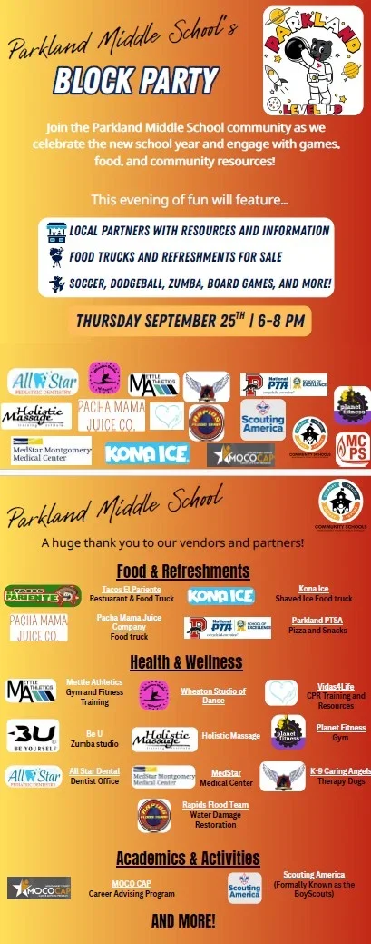 Join the Parkland Middle School community to celebrate the new school year with a Block Party! Event will include: